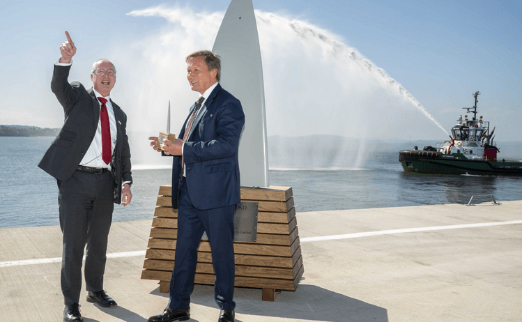 (l-r) Stuart Wallace, CEO of Forth Ports, with Charles Hammond OBE at the unveiling of a sculpture marking the naming of the Charles Hammond Berth at the Leith Renewables Hub with the Kittiwake tug in the background providing the salute with its water cannons.